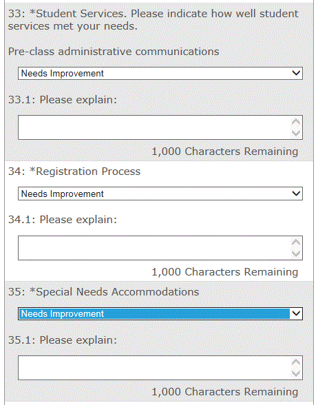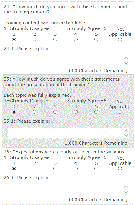 For questions 24-29, selecting a rating of 1 or 2 displays the follow-up question.