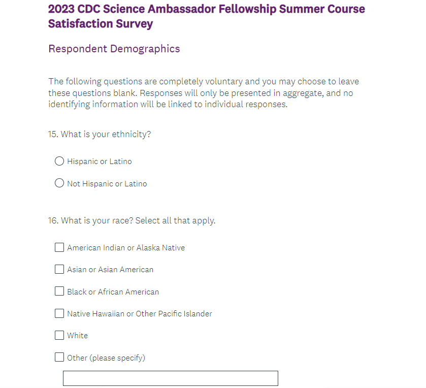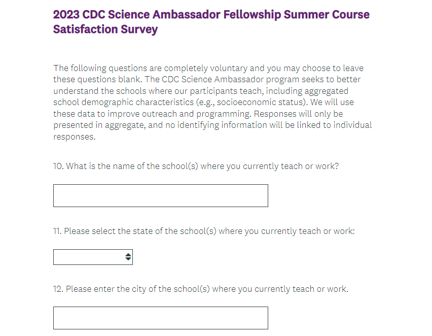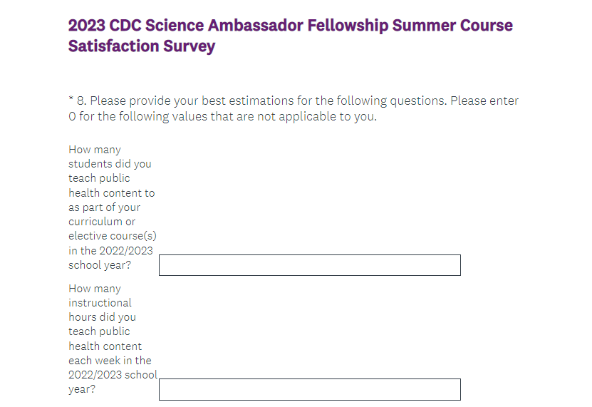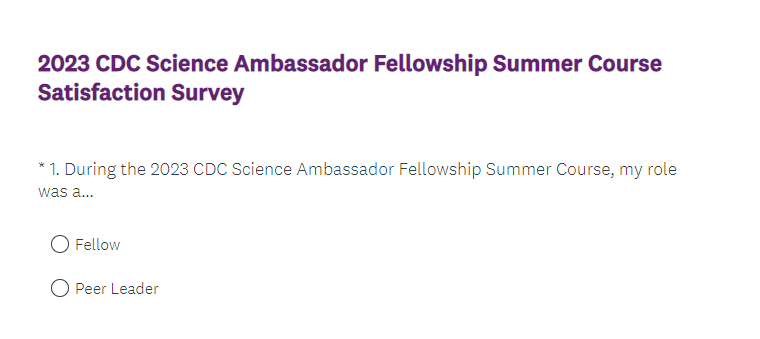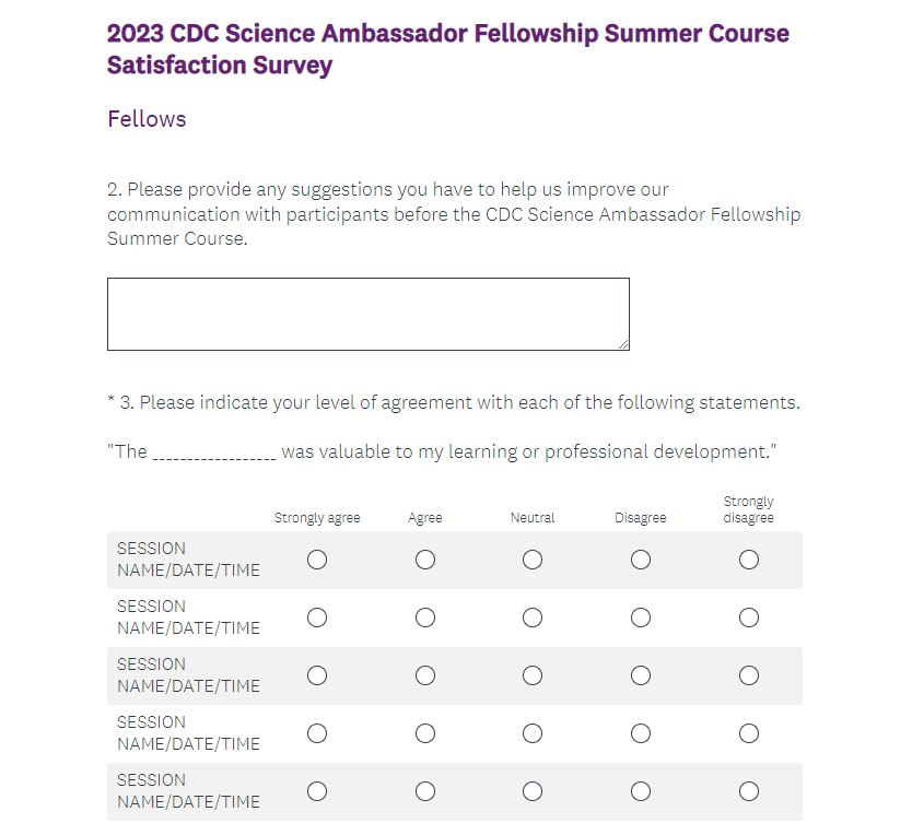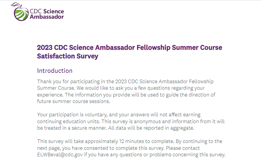 Attachment 2. 2023 CDC Science Ambassador Fellowship Summer Course Satisfaction Survey Screenshots