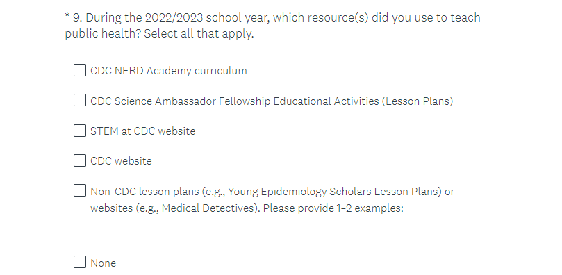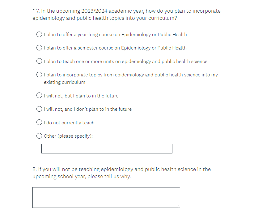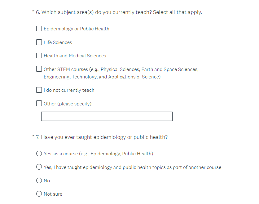Skip logic for question 16 (also potentially labeled 7) determines which questions the respondent sees. Respondents who indicate they have taught public health previously see questions 17-18 (also potentially labeled 8-9). Respondents who indicate that they have not skip to question 19 (also potentially labeled 10 or 8).