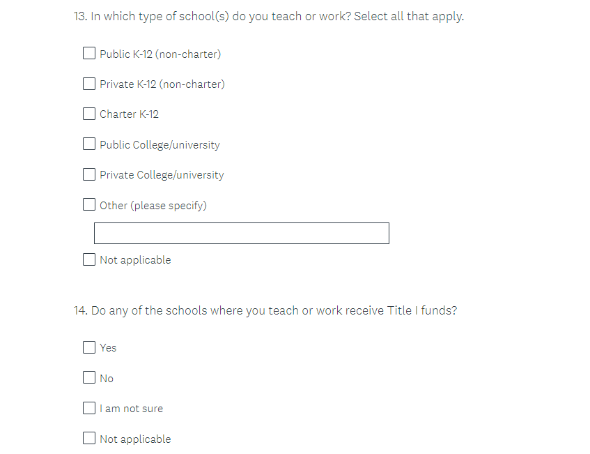 Questions 19-27 (also potentially labeled 10-19 or 8-17) are for all respondents. These questions are all voluntary and may be skipped.