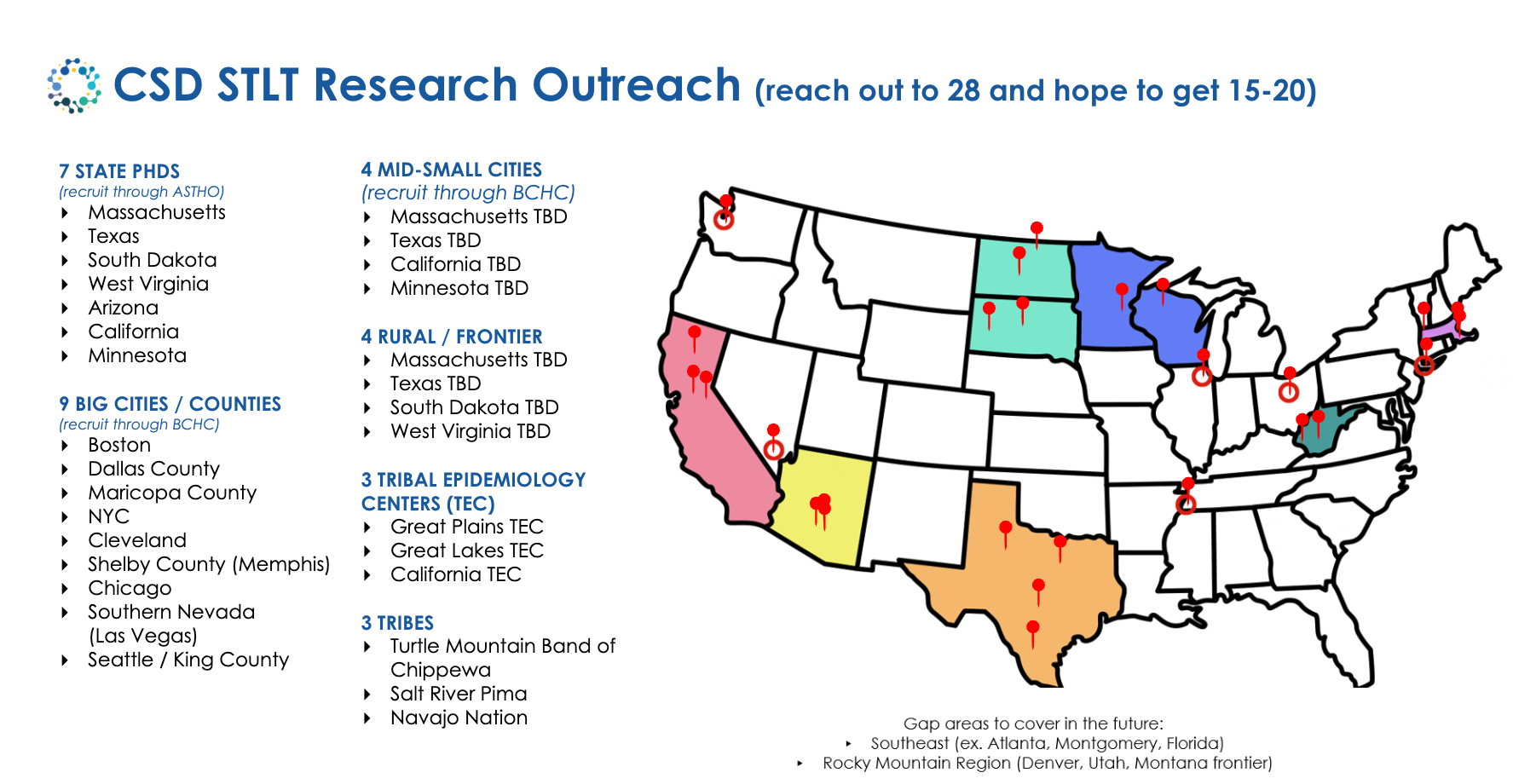 We consulted with internal subject matter experts and national partners like CSTE and NACCHO to understand which public health departments would give us the best variety across factors like population, disease burden, funding, and governance.