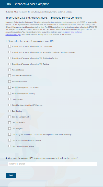 Paperwork Reduction Act Statement: This information collection meets the requirements of 44 U.S.C 3507, as amended by section 2 of the Paperwork Reduction Act of 1995. You do not need to answer these questions unless we display a valid Office of Management and Budget control number. The OMB control number for this information collection is 2700-0153 and it expires on 08/31/2027. We estimate that it will take about 5 minutes to read the instructions, gather the facts, and answer the questions. You may send comments on our time estimate above to agency-idas-customer-care@mail.nasa.gov. Send only comments relating to our time estimate to this address.
