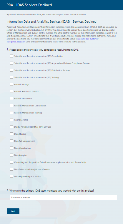 Paperwork Reduction Act Statement: This information collection meets the requirements of 44 U.S.C 3507, as amended by section 2 of the Paperwork Reduction Act of 1995. You do not need to answer these questions unless we display a valid Office of Management and Budget control number. The OMB control number for this information collection is 2700-0153 and it expires on 08/31/2027. We estimate that it will take about 5 minutes to read the instructions, gather the facts, and answer the questions. You may send comments on our time estimate above to agency-idas-customer-care@mail.nasa.gov. Send only comments relating to our time estimate to this address.