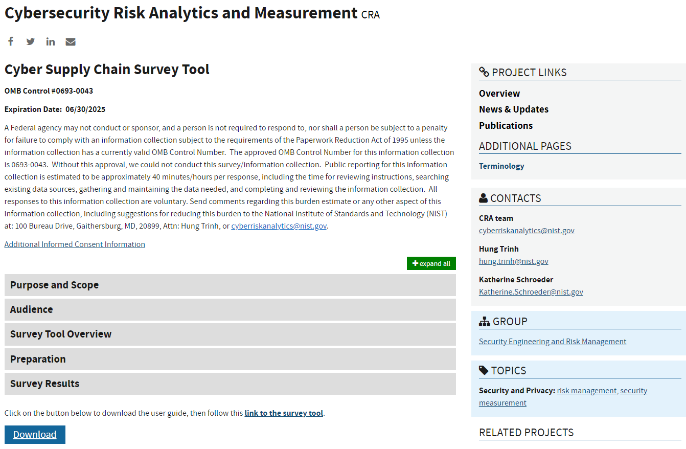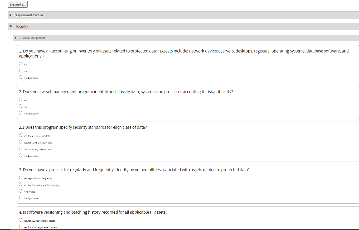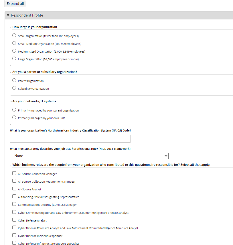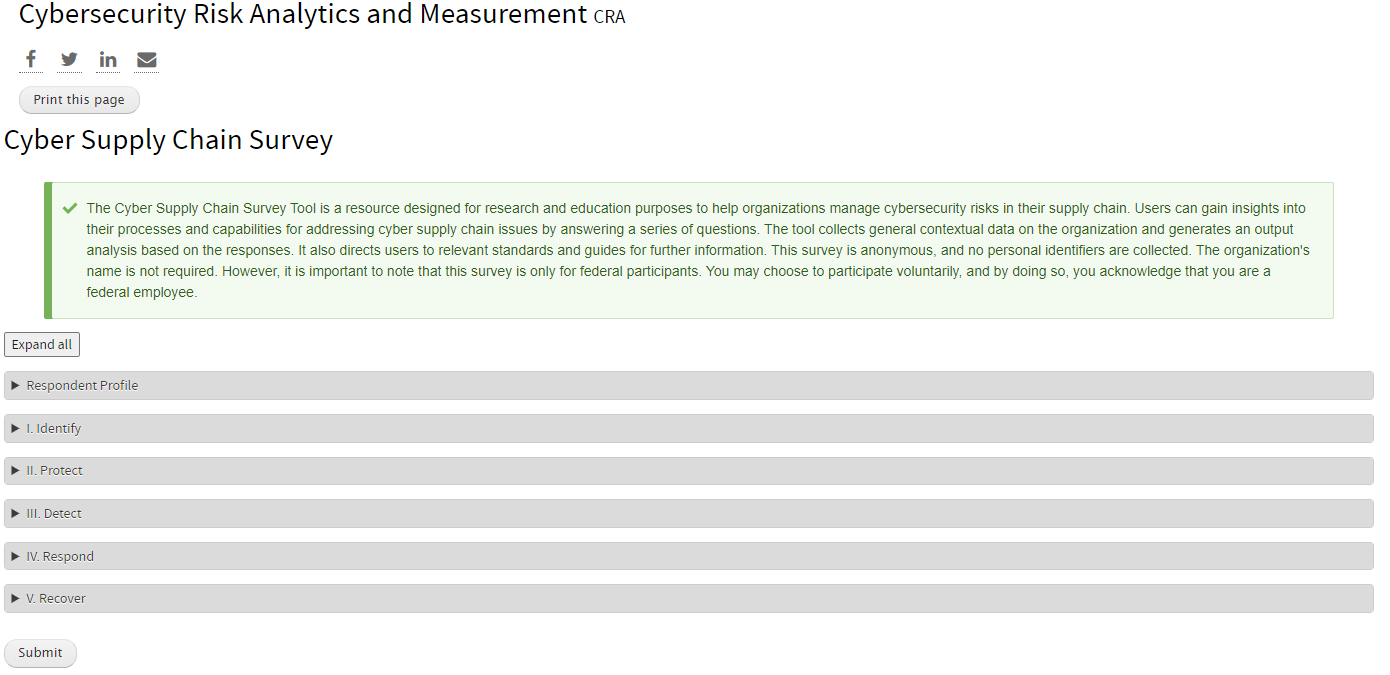 The link from the front page has a link to the Cyber supply chain survey page where the survey questionnaire is located. They are divided into six expandable sections.