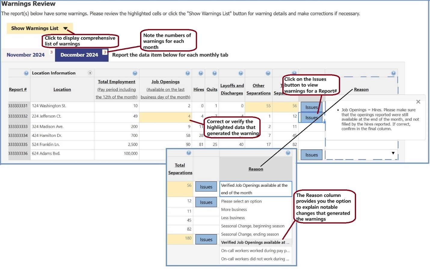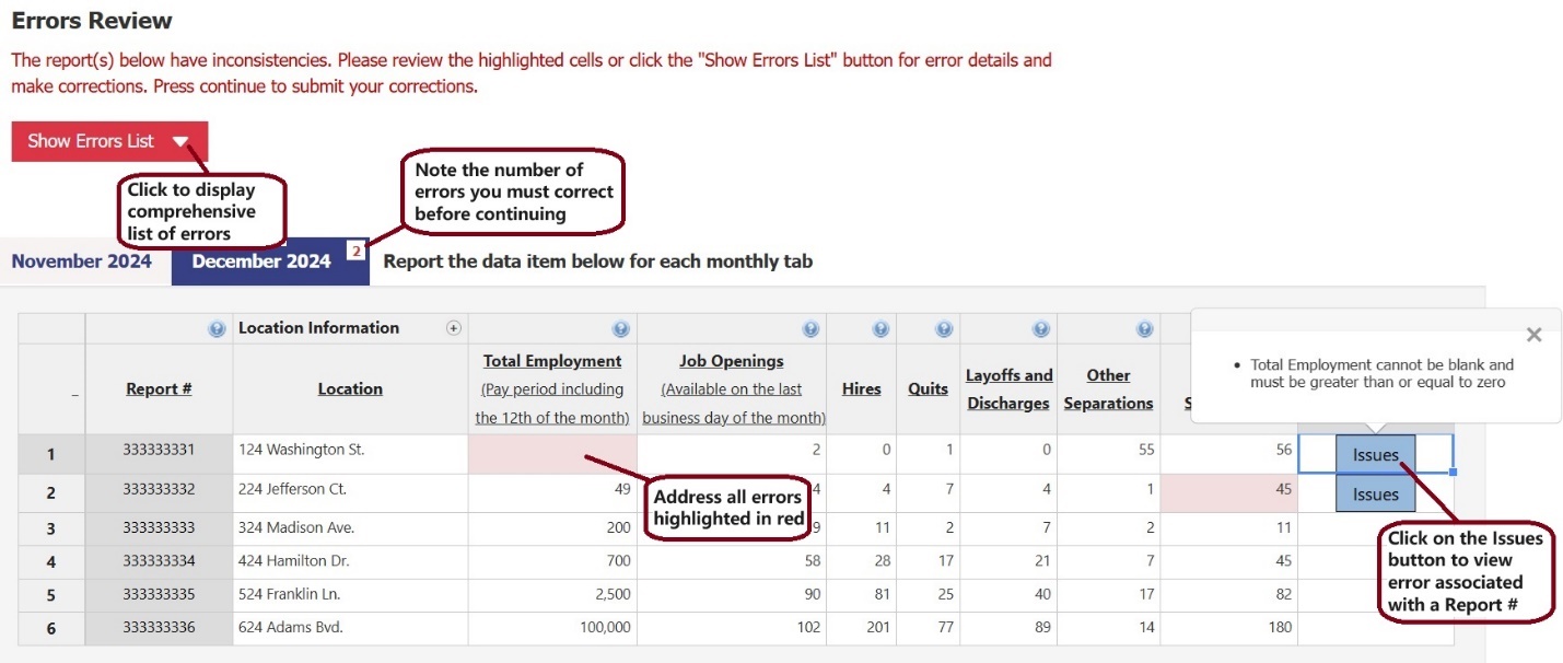 Step 5 — Review messages. The system reviews your data to identify potential problems. This step identifies inconsistent data that you must correct to move forward. To view the specific issues, press the “Show Errors List” or click on the “Issues” button associated with a report. Examples of possible problems include: