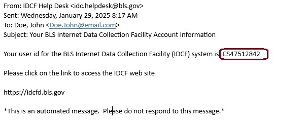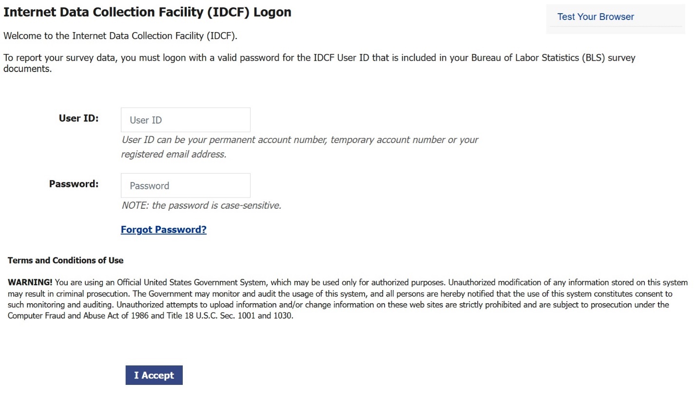 Follow the link (https://idcf.bls.gov) in either email and enter your Temporary ID and Password.