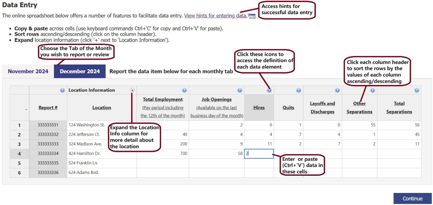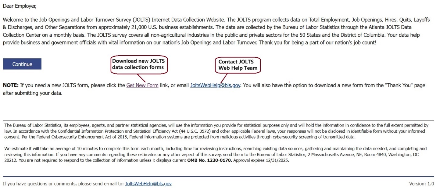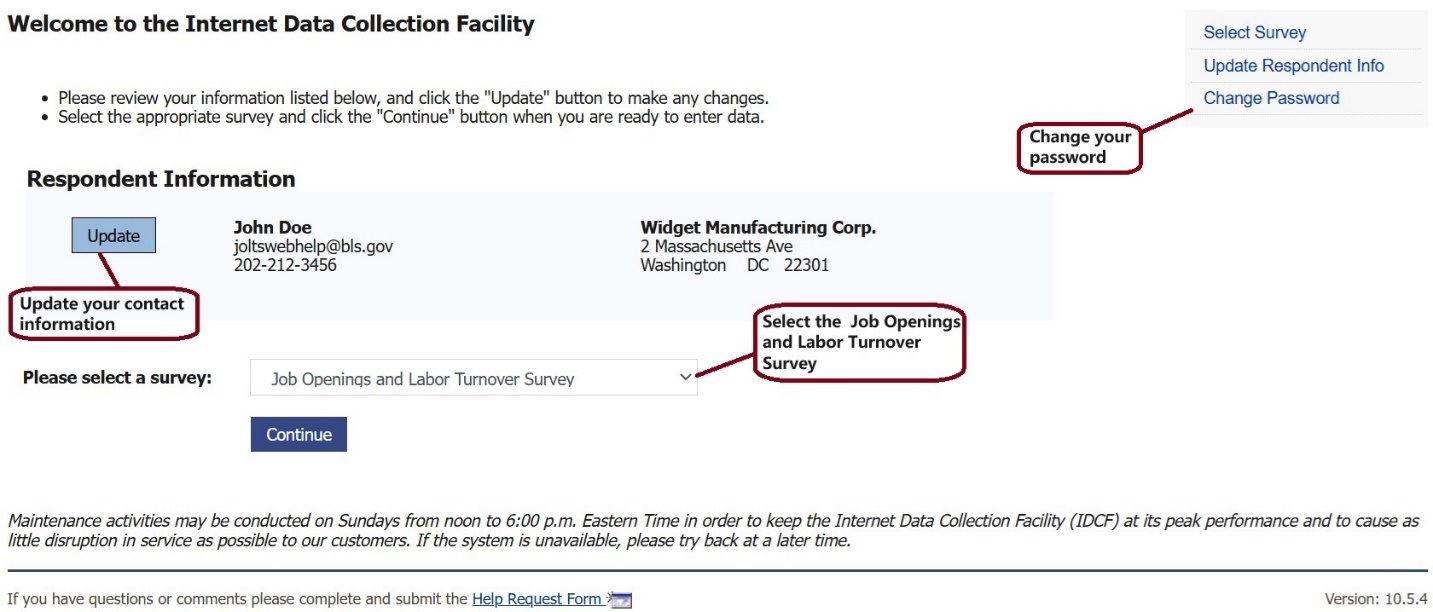 Step 2— Review your contact information, select the JOLTS survey, and select Continue. Here you can also: