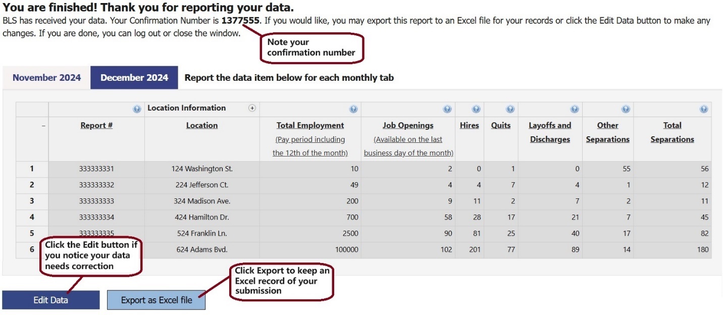 Step 7 —Review your data. The “Thank You” screen displays all your data and confirms that you have successfully submitted your data. On this screen, you can:
