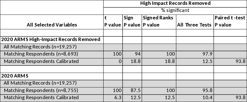 These results indicate removal of High Impact Records did not produce questionably adverse impacts to the tested hypotheses. No comparisons to previous studies are made since High Impact Records process began in 2016. For the 2020 ARMS cycle, the sixty-two High Impact Records were not impactful enough to alter the original calibration result when viewed from the perspective of percent significant of selected statistical tests.