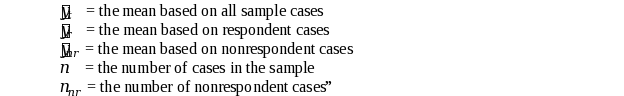 “Given a survey with an overall unit response rate of less than 80 percent, conduct an analysis of nonresponse bias using unit response rates as defined above, with an assessment of whether the data are missing completely at random. As noted above, the degree of nonresponse bias is a function of not only the response rate but also how much the respondents and nonrespondents differ on the survey variables of interest. For a sample mean, an estimate of the bias of the sample respondent mean is given by:
