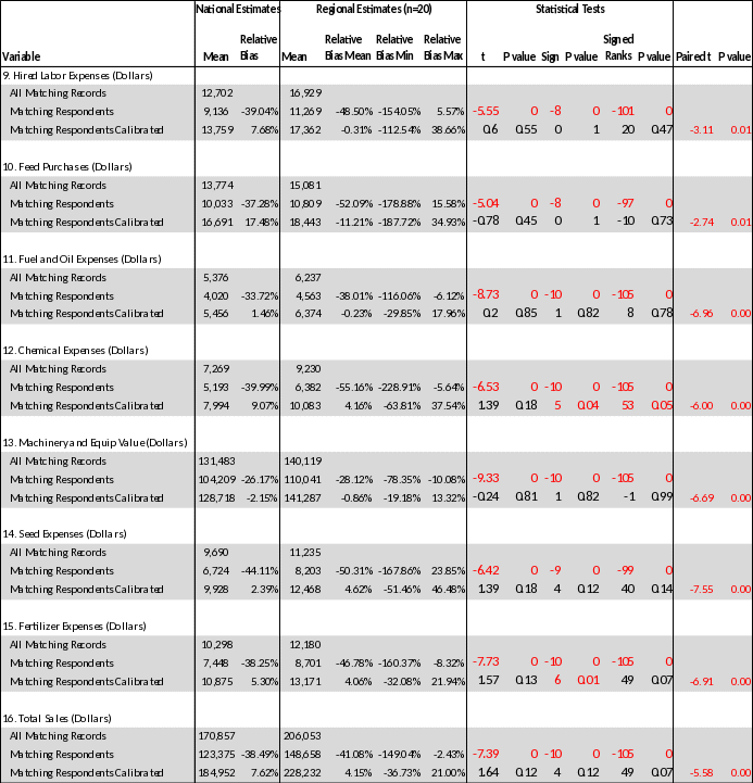 Paired t tests suggest the null hypotheses of “No Mean Bias Reductions” are rejected for fifteen of the sixteen study variables. The current rate of significant Mean Bias Reductions of 93.8 is well above the 29.4 and 76.5 percent found in 2005 and 2006, respectively. A possible explanation for the improvements in paired t test may be that a richer set of calibration targets were used in 2020 relative to the previous studies. Over time, NASS has evolved the targeted data set from about twelve targets in 2002, to about thirty targets in 2020. The 2005 and 2006 studies used twelve targets.