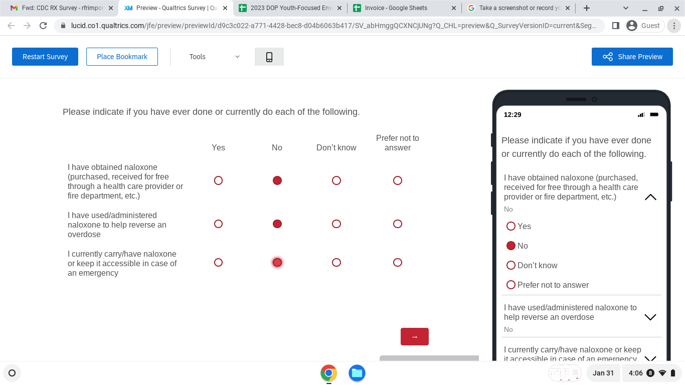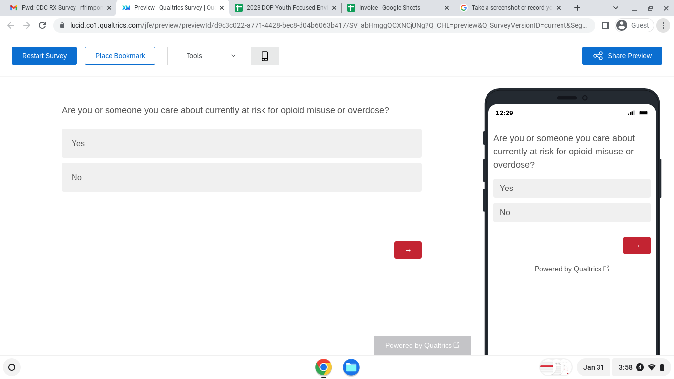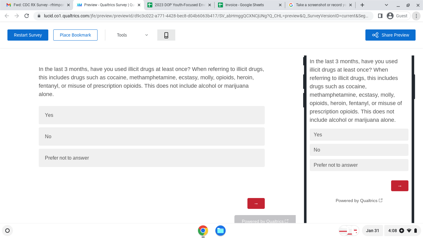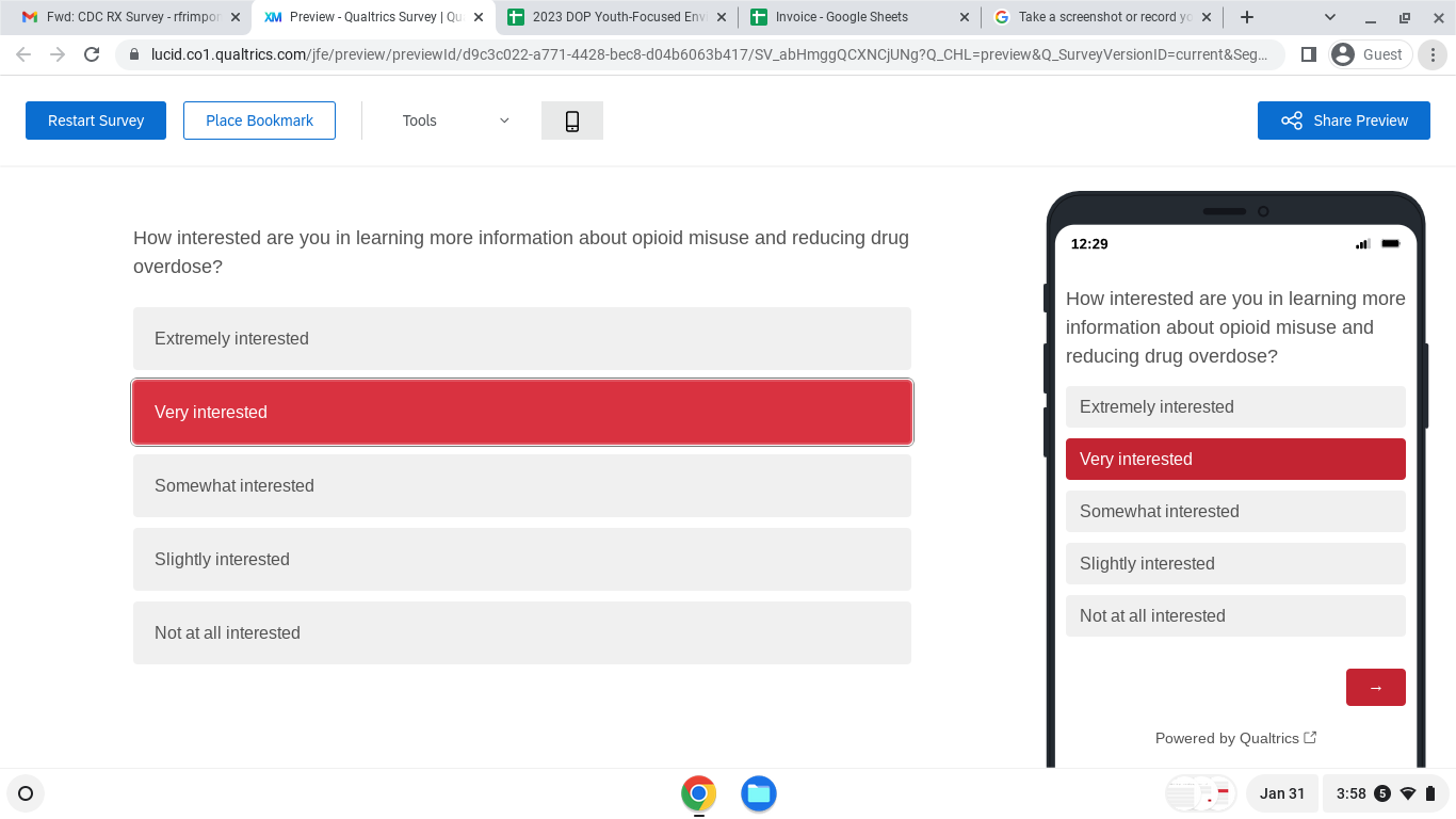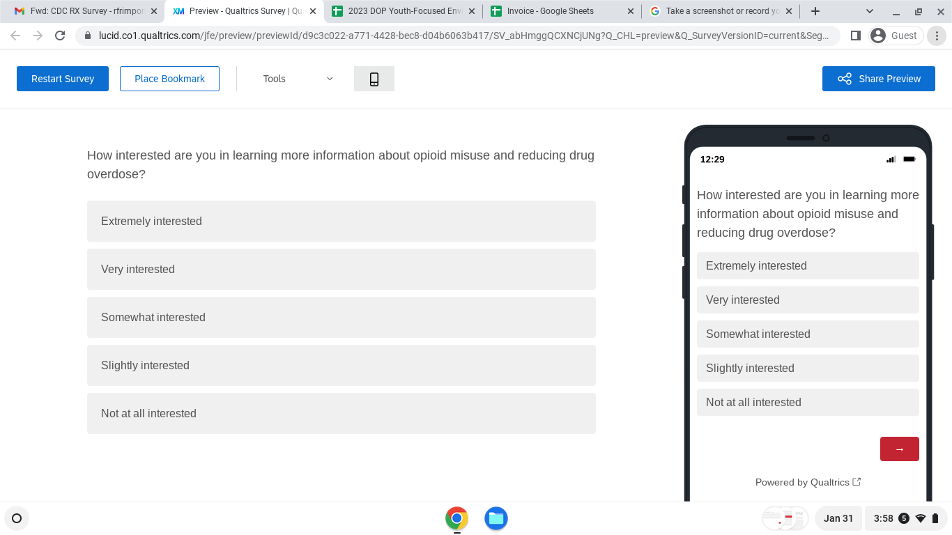 The Centers for Disease Control and Prevention (CDC) developed and launched the Stop Overdose campaigns, four education campaigns, to prevent and reduce drug overdoses. This is research in which you will respond to multiple choice and open-ended questions to give your opinions about Stop Overdose campaign messages and materials. Participation is voluntary and you may complete all or some of the survey. If you have questions about this research, you may contact the principal investigator, Everett L. Long, PhD., by email at elong@brunetgarcia.com or phone, (704)-657-5338.