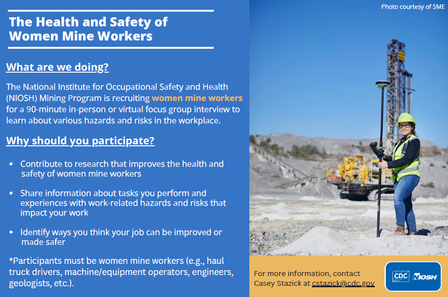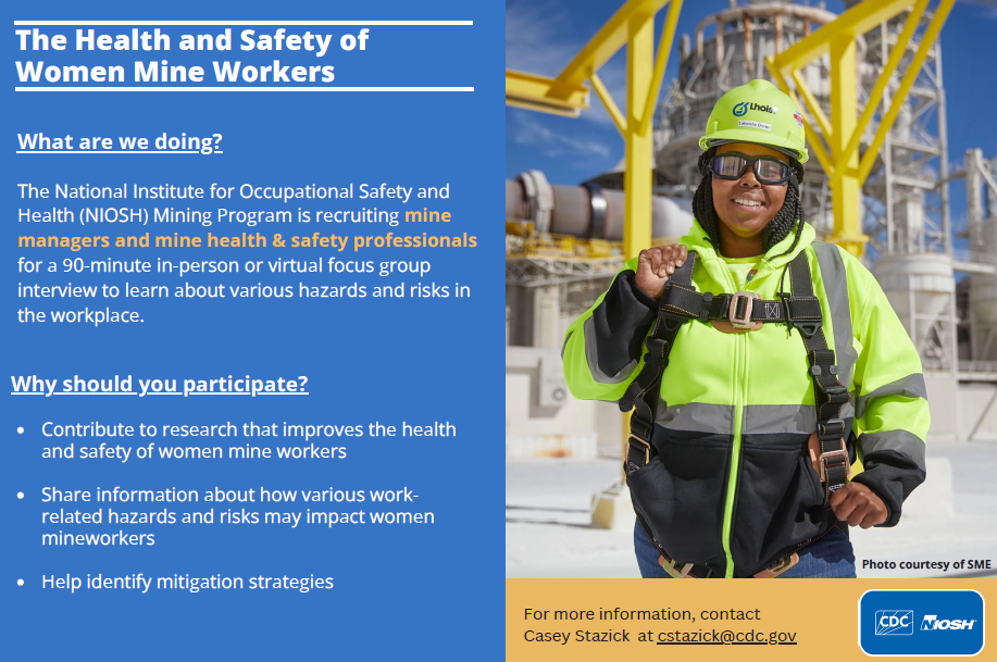 We are conducting a study to learn about the experiences of women working in the U.S. mining industry. We are currently recruiting mine managers and mine health and safety professionals to participate in either in-person or virtual focus groups for about 90 minutes. We will ask questions about your mine site and your job and work history; different job tasks performed at your site and their related hazards that may be posing additional risk(s) or burden on women mine workers who are performing those jobs; and potential mitigation strategies.