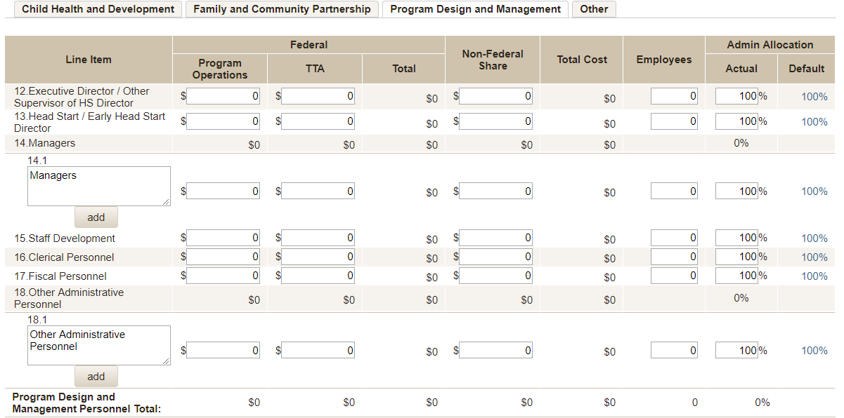 Separate projected budgets must be completed for both Head Start and Early Head Start program operations and Head Start and Early Head Start training and technical assistance by grant and by delegate.
