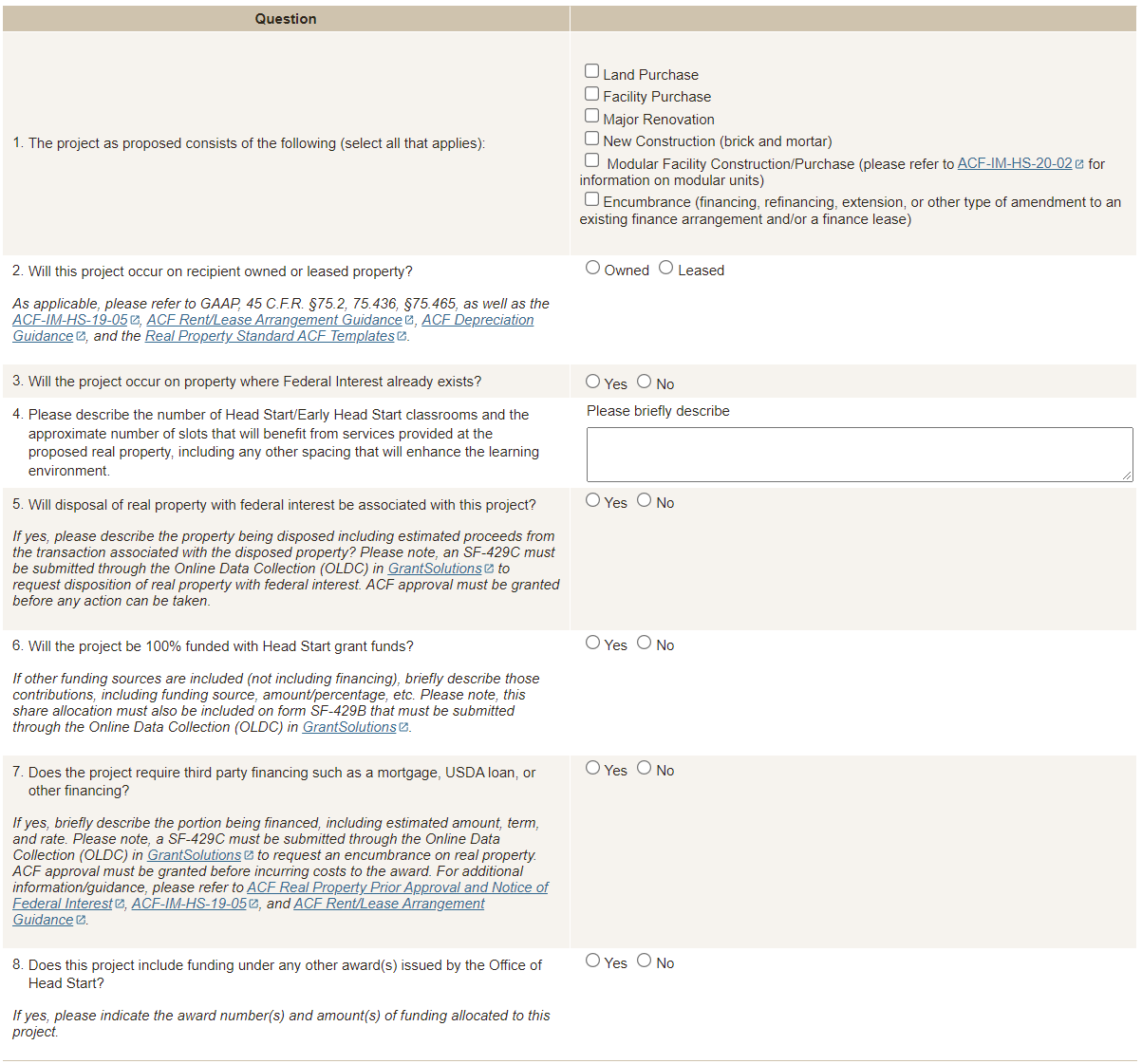 Use this amendment when requesting prior approval to use Head Start funds for the purchase, construction, or major renovation of real property that meets the requirements of 45 C.F.R. Part 1303. This includes fulfilling requirements of restricted funds awarded for real property (i.e. startup) pending submission and approval of a complete 1303 application, for budget revisions, including requests to encumber (financing arrangements, including a finance lease (formerly called capital lease)) real property using Head Start funds. |