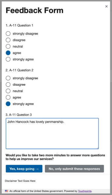 We propose to use Touchpoints (Touchpoints - Product Overview (v2) (digital.gov)), a .gov platform provided as a shared service by the U.S. General Services Administration, to administer the customer service feedback survey.