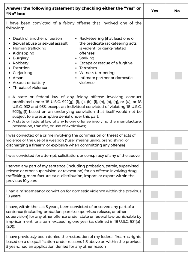 U.S.C. § 925(c) and 28 C.F.R. § 107.1 to determine whether restoration of federal firearms rights should be issued. The routine uses of this information include making determinations on eligibility. Information will also be disclosed to other Federal, State, foreign, and local law enforcement and regulatory agencies to verify information provided on the application. [TBD]. You must provide the requested information to apply for a restoration of your rights. Failure to do so will result in a denial and an inability to process the application. Solicitation of your social security number is made pursuant to 78 U.S.C. § 925(c), and E.O. 9397, and it will be used to verify your identity. If granted, your name, address, court of conviction, and date of conviction will be published in the Federal Register, as required by 78 U.S.C. § 925(c). You must consent to this disclosure in order to apply for restoration of your federal firearms rights.