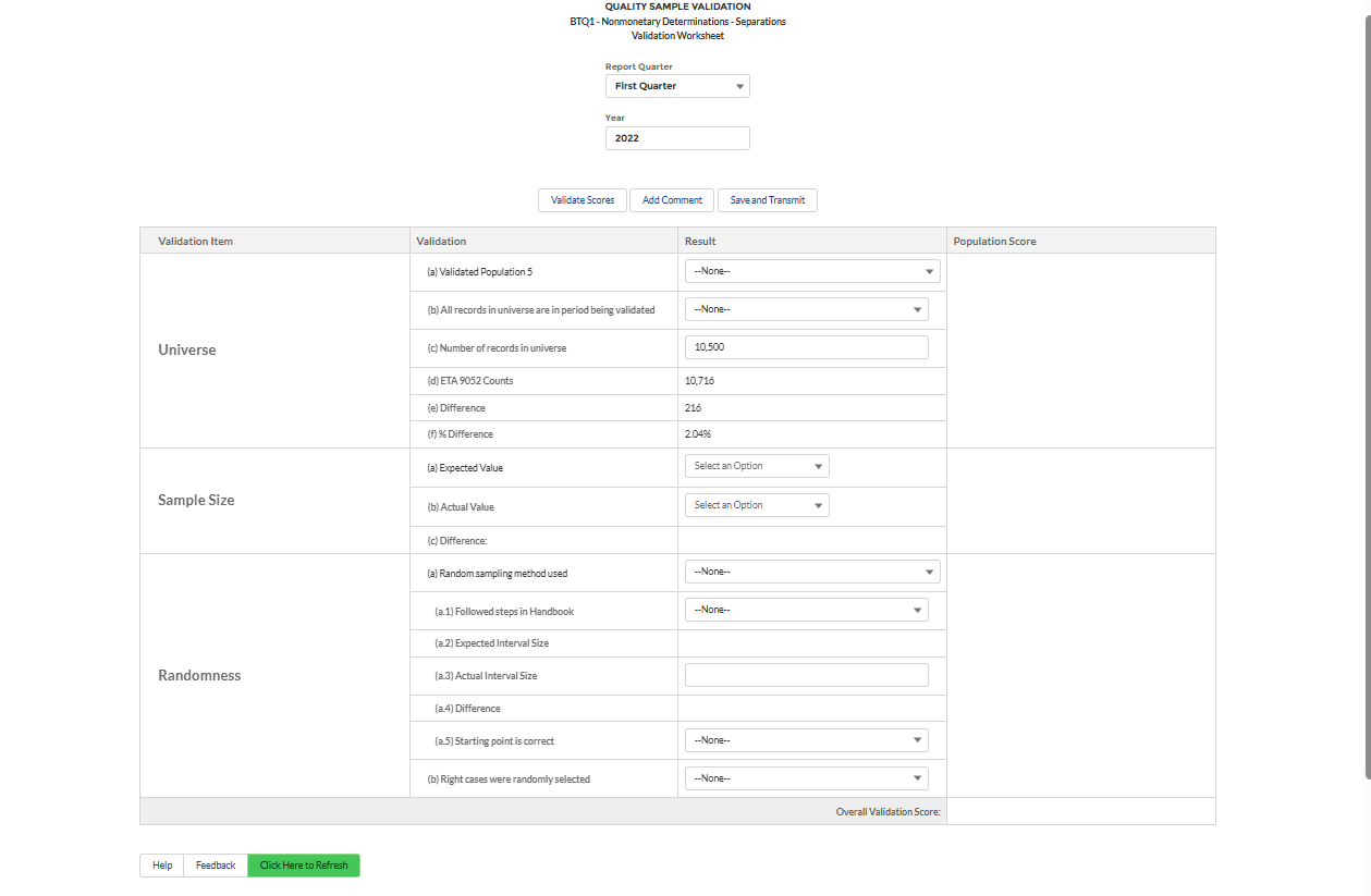 States are required to validate reported data every third year, except for data elements used to calculate Government Performance and Results Act (GPRA) measures, which must be validated annually. Items that do not pass validation must be revalidated the following year. The “validation year” coincides with the State Quality Service Plan (SQSP) performance year. It covers data of any reporting period during the twelve months beginning April 1 and ending March 31. Results must be submitted to the National Office by June 10, which allows sufficient time for data validation results to be included in the SQSP process. States that fail DV or do not submit their DV results by the established deadline must address these deficiencies through the SQSP. If states modernize their UI benefits data management system, partially, completely, or in any way that impacts reporting and therefore data validation, states must validate every benefits population the following year once the new system is deployed or goes live. This requirement includes populations with passing scores that were previously valid for three years and not yet due for validation. Similarly, if a state does not submit the underlying benchmark populations (Benefits Populations 5 and 8; Tax Populations 3 and 5) to complete Module 4 within the three year validation cycle, the scores will also not be considered valid until these are transmitted. If a state revises an ETA UI Required Report for the same time period it used for data validation, the data validation score will not be considered valid until the state resubmits the results using the revised report counts.