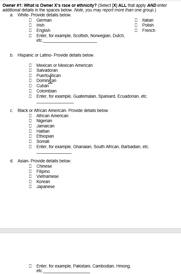 Owner #1: What is Owner X’s race or ethnicity? (Select [X] ALL that apply.)