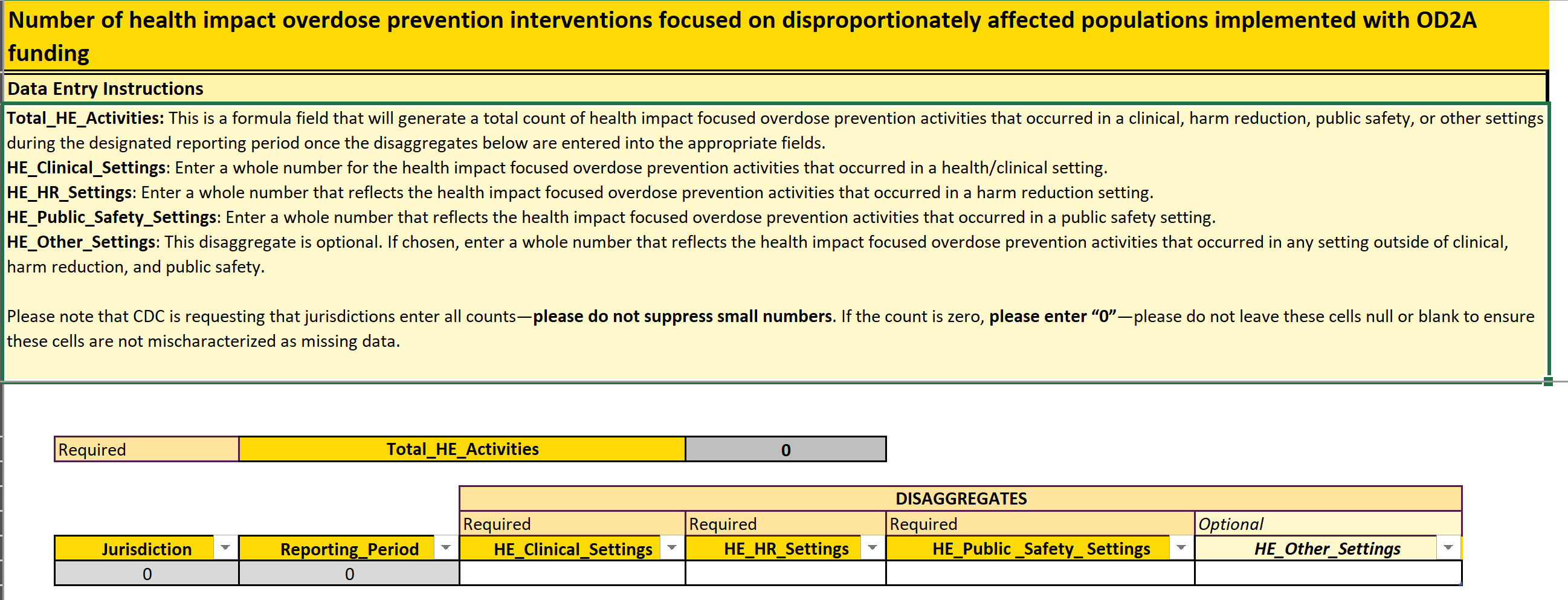Please note that CDC is requesting that jurisdictions enter all counts—please do not suppress small numbers. All numbers will be available to the CDC OD2A-S Program Evaluation Team, and small counts will not be shared with anyone outside the support team. The CDC OD2A-S Program Evaluation Team will aggregate small counts before any data are shared, and we will consult with recipients on plans to share data. If the count is zero, please enter “0”—please do not leave these cells null or blank to ensure these cells are not mischaracterized as missing data.