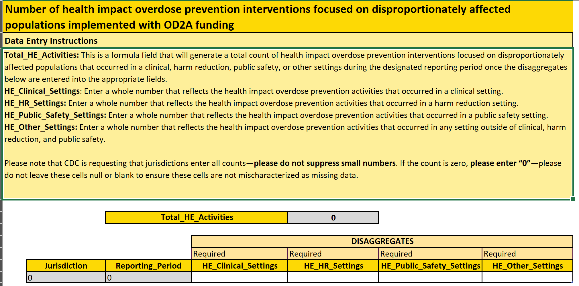 | Reporting Specifications | Total_HE_Activities This is a formula field that will generate a total count of health impact overdose prevention interventions focused on disproportionately affected populations that occurred in a clinical, harm reduction, public safety, or other settings during the designated reporting period once the disaggregates below are entered into the appropriate fields.