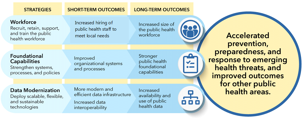 On November 29, 2022, the Centers for Disease Control and Prevention (CDC) awarded $3.2 billion to help state, local, and territorial and freely associated public health agencies across the U.S. strengthen their public health workforce and infrastructure through the Public Health Infrastructure Grant (PHIG). This grant provides 107 jurisdictions (Component A recipients) with disease-agnostic funding to support public health infrastructure needs. The three grant strategies are Strategy A1: Workforce; Strategy A2: Foundational Capabilities; and Strategy A3: Data Modernization. The priority short-term outcomes recipients are expected to achieve by the end of the five (5)-year period of performance include: (1) Increased hiring of public health staff to meet local needs and (2) Improved organizational systems and processes, among other outcomes. In the long term, expected outcomes include: (1) Increased size and capabilities of the public health workforce; (2) Stronger public health foundational capabilities; (3) Increased availability and use of public health data; and (4) Improved sharing of lessons learned.
