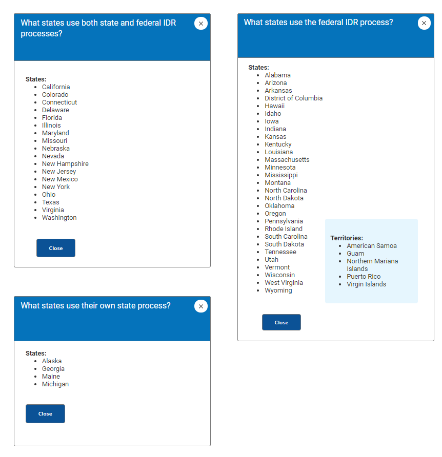 Review the IDR State list to determine which states will have processes that apply to payment determinations for the items, services, and parties involved. FEHB carriers are subject to the Federal IDR process unless OPM contracts with FEHB carriers to include terms that adopt state law as governing for this purpose.