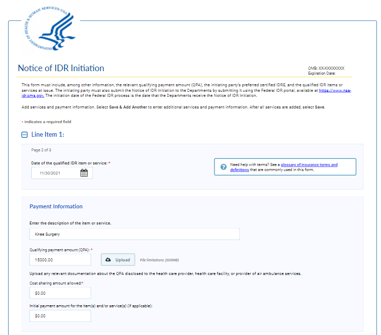 This form must include, among other information, the relevant qualifying payment amount (QPA), the initiating party’s preferred certified IDR entity, and the qualified IDR items or services at issue. The initiating party must also submit the Notice of IDR Initiation to the Departments by submitting it using the Federal IDR portal, available at https://www.nsa-idr.cms.gov. The initiation date of the Federal IDR process is the date that the Departments receive the Notice of IDR Initiation.