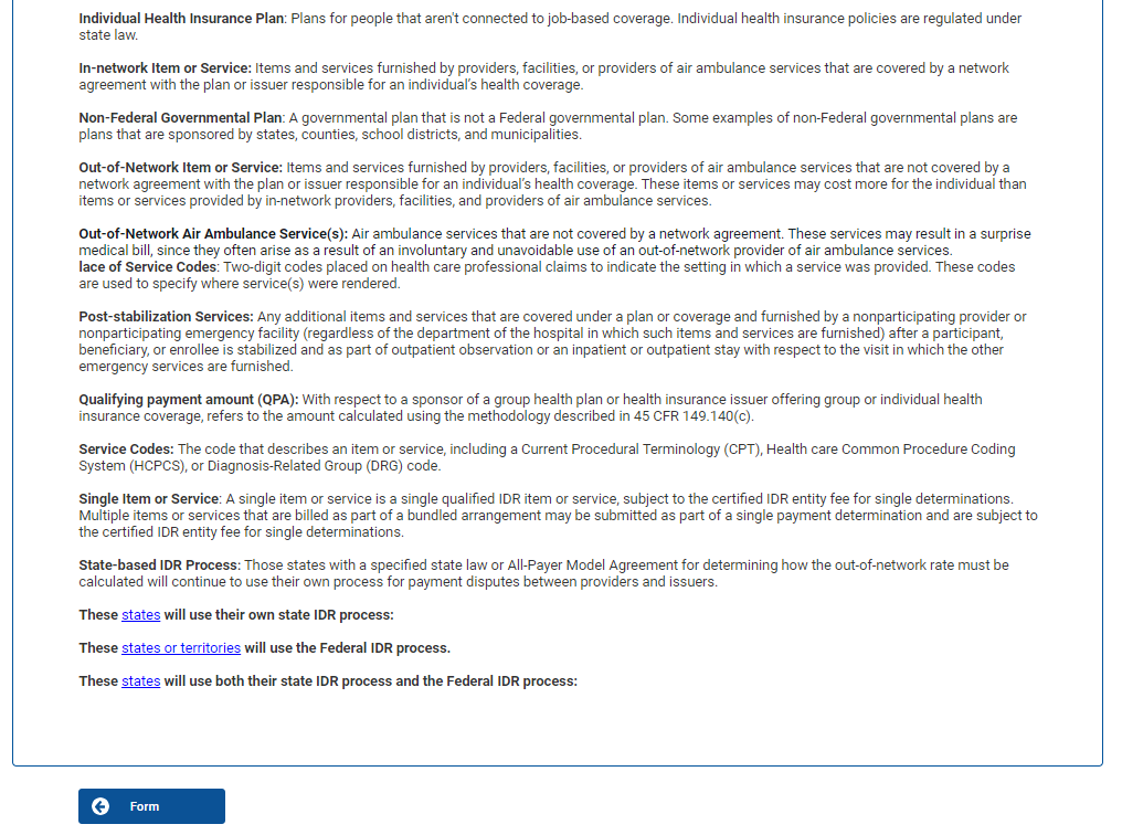 By using forms we provide for use in connection with the Federal Independent Dispute Resolution (IDR) process, you agree to the collection and use of information as described in this Privacy Act Statement.