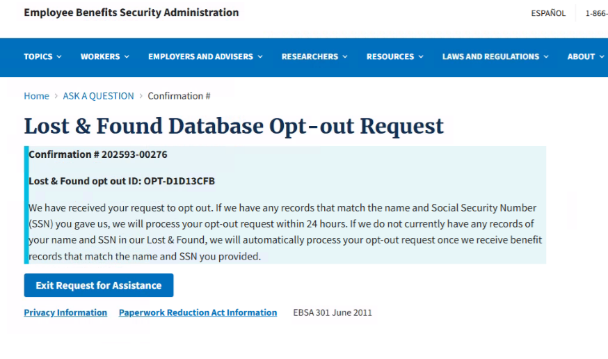 If there is no open inquiry and they select any option but (the opt out, or the SSA notice), they will receive this confirmation screen.