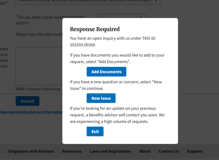 For all selected options (except the opt out) if submitter has an open inquiry – they will receive this screen.