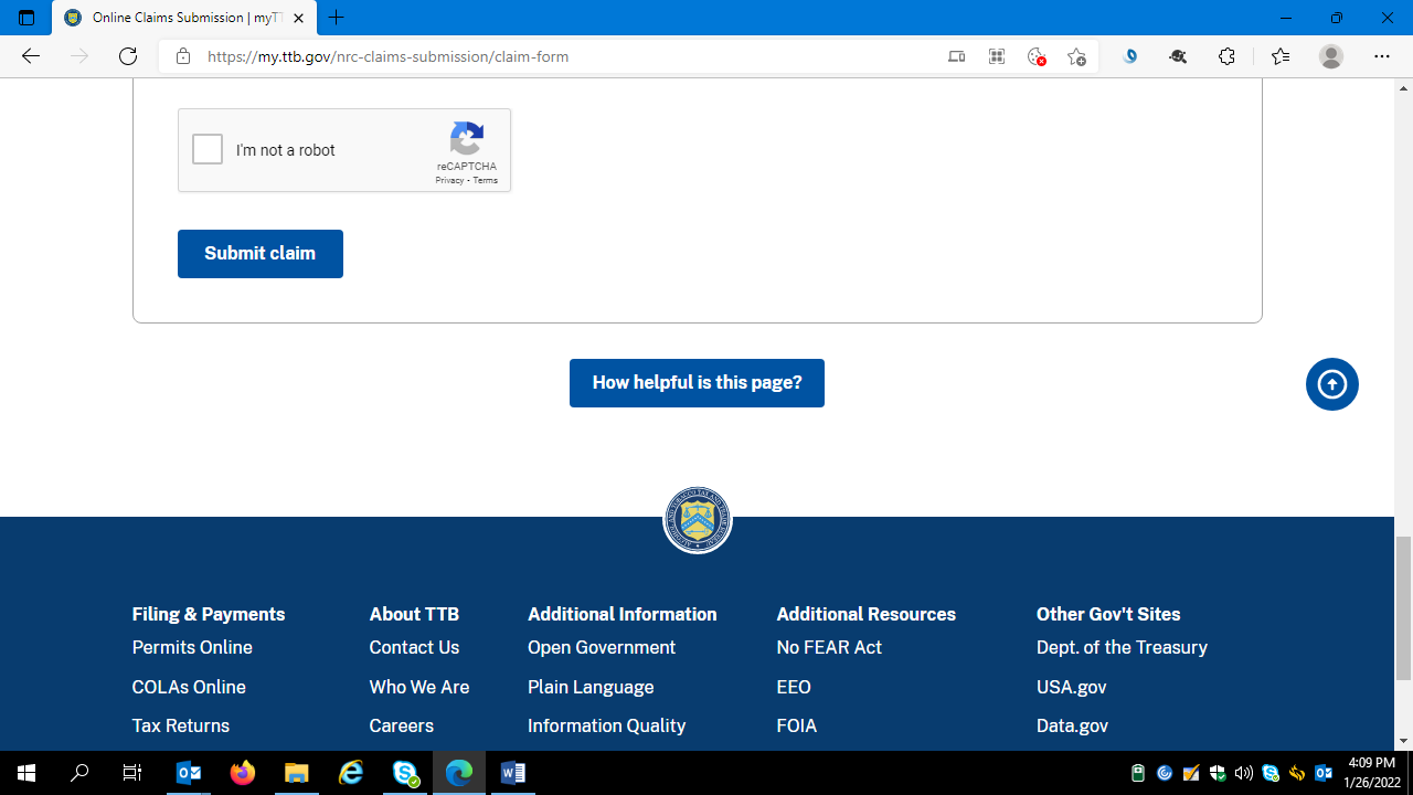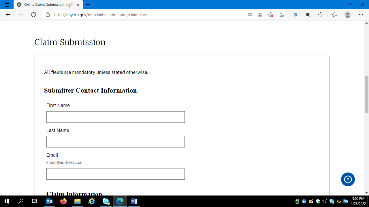After downloading and completing a fillable-printable TTB F 5620.8 form from the TTB website (https://www.ttb.gov/forms), respondents may electronically upload and submit the completed form and any required supporting documents to TTB via the Online Claims Submission portal on the TTB website at https://my.ttb.gov/nrc-claims-submission/claim-form.