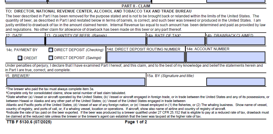In response to E.O. 14247, TTB is revising form TTB F 5130.6 to add Items 14c, 14d, and 14e, which will allow the respondent to select payment of the claimed excise tax drawback either by direct deposit to a checking or savings account or as a credit to be taken on their alcohol excise tax return, and, if the respondent selects the direct deposit option, supply their direct deposit routing number and bank account number.