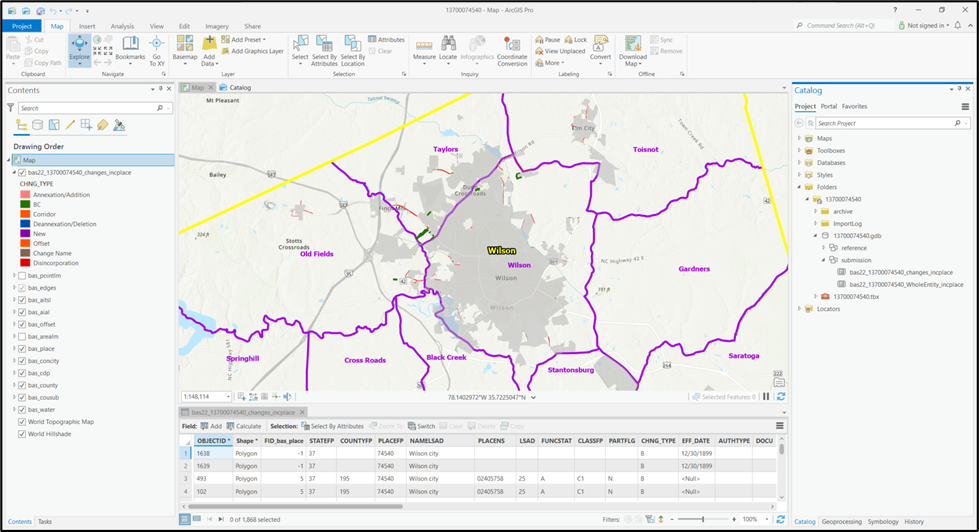 Loading the data (with or without a query) into the changes feature class so that individual fields can be mapped into the Census Bureau requested schema.