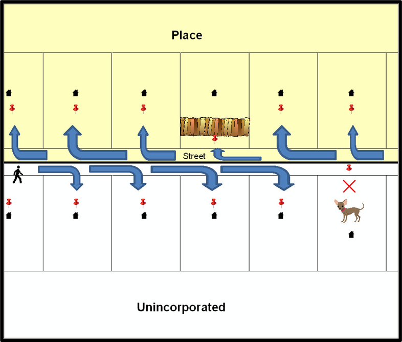 Notice that it is occasionally not possible for the field worker to go all the way to the front door due to unforeseen circumstances, like the fence or the dog shown above. Thus, the MSP (represented here by the red pins) can sometimes fall within the road or the road right-of-way.