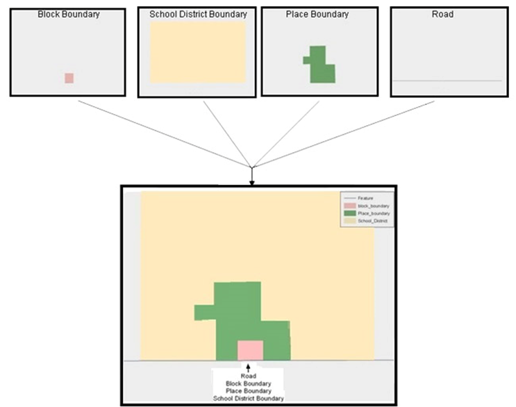 This example shows an overlay of four separate feature classes. Notice how the topological relationship is compromised. The block, place, and school district boundaries, which are supposed to follow the road feature, are no longer aligned with the road in several locations.