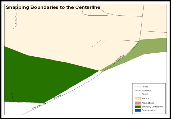 These boundary corrections are not snapped to existing linear features in the MAF/TIGER System. The Census Bureau will snap both boundary corrections to the centerlines to avoid population being assigned to incorrect governments.
