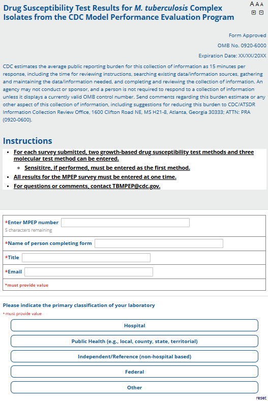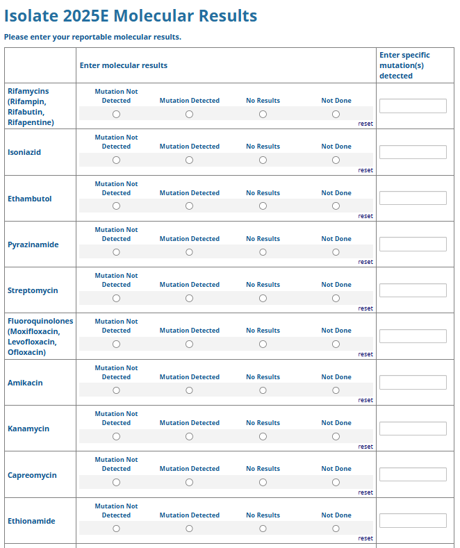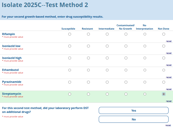 Respondents are able to submit up to two growth-based drug susceptibility testing (DST) methods and results and three molecular testing methods and results. The data collection instrument is built to include logic (a survey tool that allows a tailored question path based on respondents’ answers) to reduce burden for participating laboratories or respondents who only perform one DST method. This logic includes asking whether growth-based DST was performed (if the answer is yes, then a question is asked to determine whether a second growth-based method was performed) and whether molecular testing for drug resistance was performed (if the answer is yes, then questions are asked to determine whether a second and third molecular method was performed).