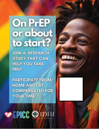 The EPICC+ research study from [site name] would like your opinion on our PrEP information. Enroll online and get up to [incentive] over 18 months for your participation.