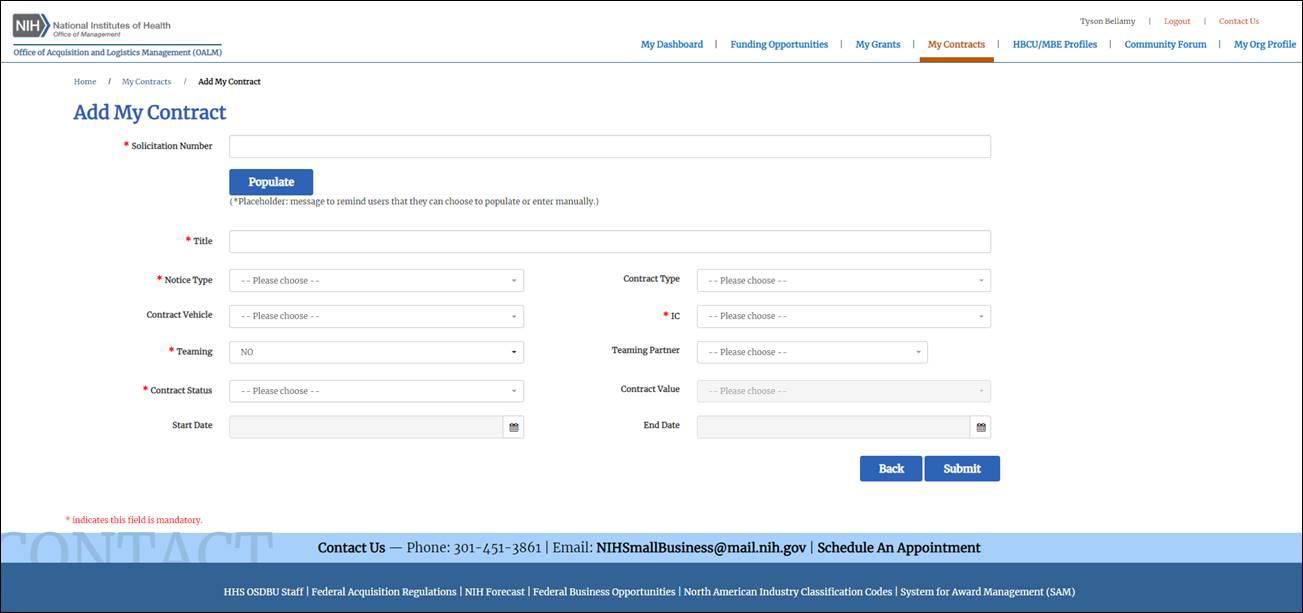 Search for and record NIH contract opportunities that you intend to pursue or received notification regarding.