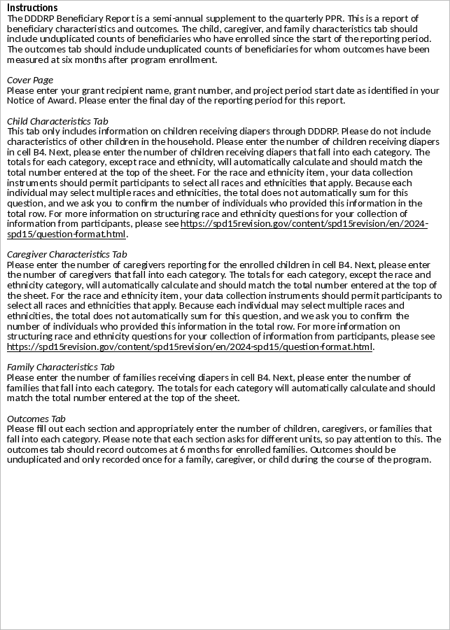 | THE PAPERWORK REDUCTION ACT OF 1995 (Pub. L. 104-13) Public reporting burden for this collection of information is estimated to average 4 hour per response, including the time for reviewing instructions, gathering and maintaining the data needed, and reviewing the collection of information. OMB Approval Number: 0970-0642 Expiration Date: 04/30/2028 An agency may not conduct or sponsor, and a person is not required to respond to, a collection of information unless it displays a currently valid OMB control number.An agency may not conduct or sponsor, and a person is not required to respond to, a collection of information unless it displays a currently valid OMB control number. |