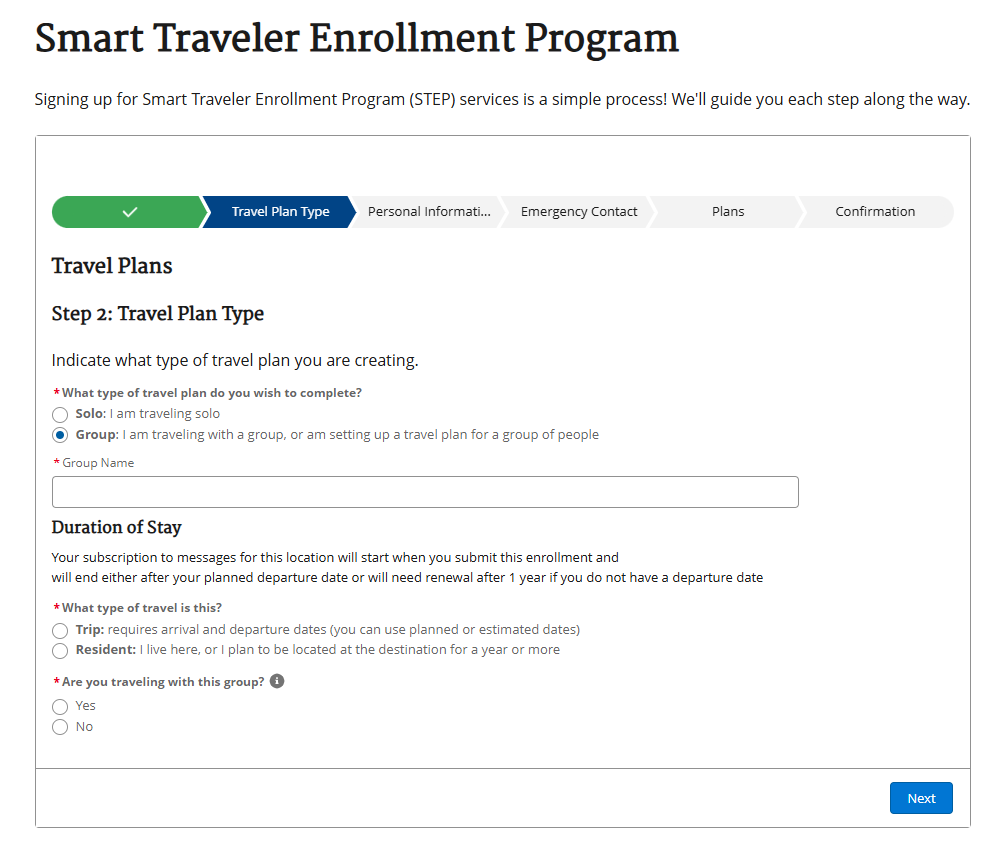 Justification: The Department developed the Smart Traveler Enrollment Program (STEP) software for U.S. nationals to electronically, securely submit their travel plans and/or subscribe to travel alerts. STEP is intended for use by U.S. nationals who may enroll online prior to or during their overseas travel. The service is available on the Department’s Bureau of Consular Affairs web site http://travel.state.gov/ or at https://step.state.gov/step/. The information received is used to provide timely safety and security information and to facilitate locating and contacting U.S. nationals in the event of a disaster or incident abroad. STEP enables the Department and its embassies and consulates abroad to better assist U.S. nationals as a means of sending targeted messages and alerts to them.