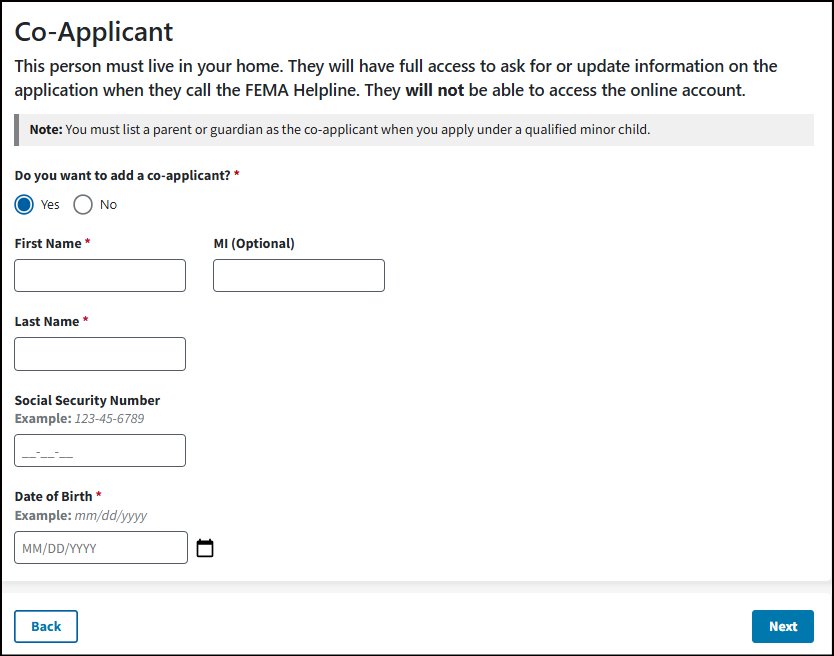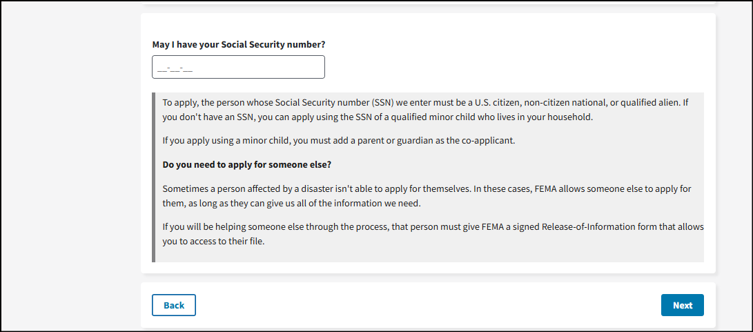 To qualify for FEMA Assistance, the person named here as the applicant must be a U.S. citizen, non-citizen national, or qualified alien. If you need to apply under a qualified minor child who lives in your household, you must enter the child's information as the applicant