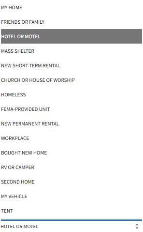 Select what caused your damage. FEMA uses this information to better understand the extent of damage in a community and any damage that needs to be reviewed by your insurance company first.
