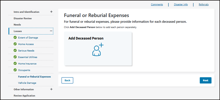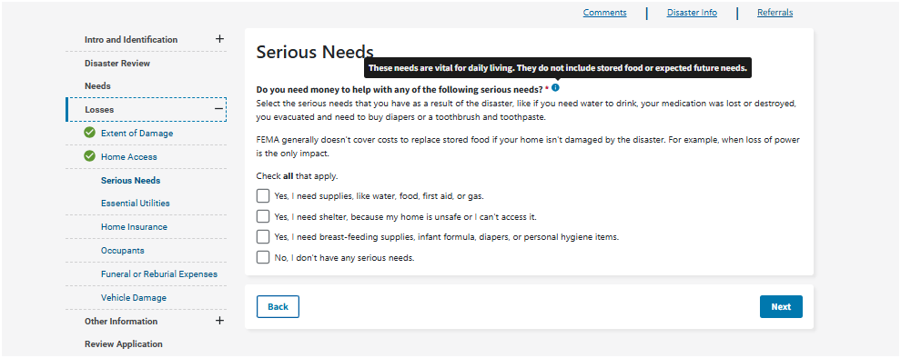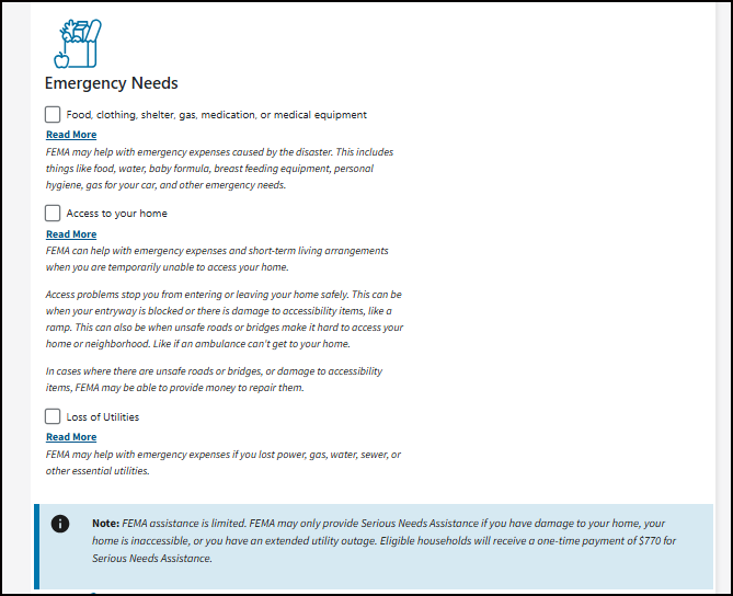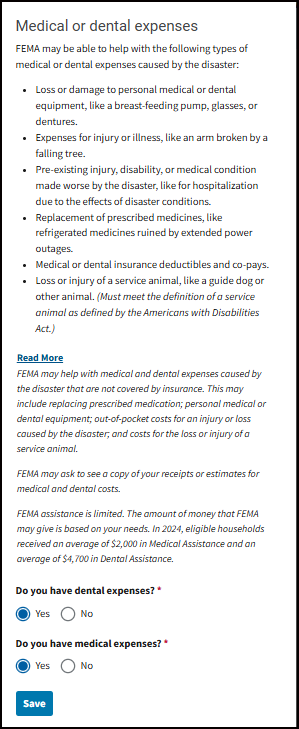 • Other Needs Assistance - This can help with some immediate needs when you can't live in your home. It may cover certain losses and expenses caused by the disaster. Things like personal property and vehicle losses; medical, dental, child care, moving and storage, and funeral expenses."