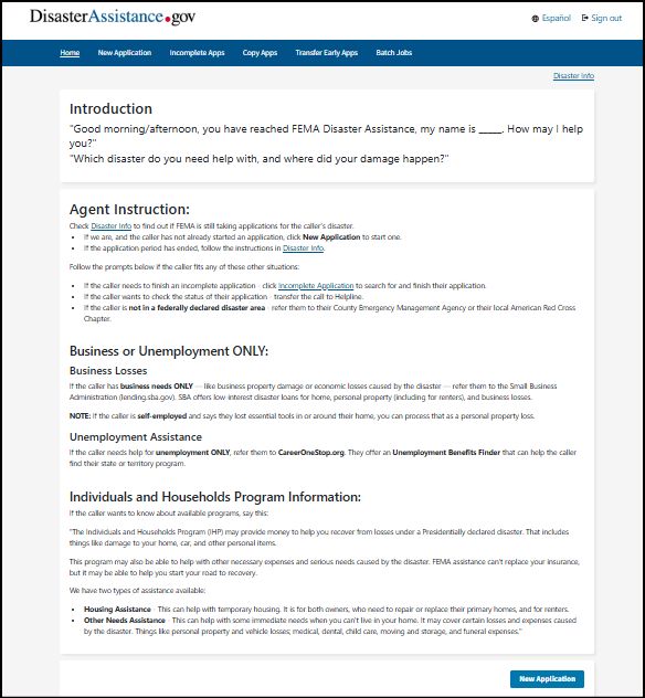 "Good morning/afternoon, you have reached FEMA Disaster Assistance, my name is _____. How may I help you?"