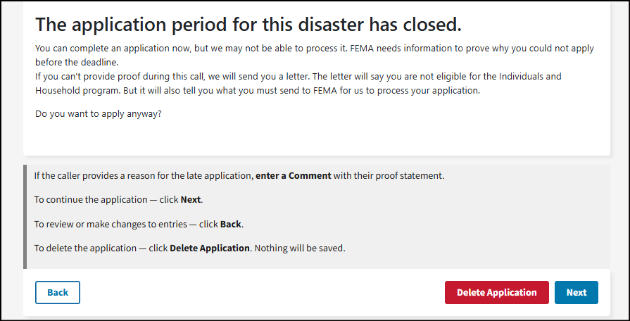 Check Disaster Info to find out if FEMA is still taking applications for the caller's disaster.