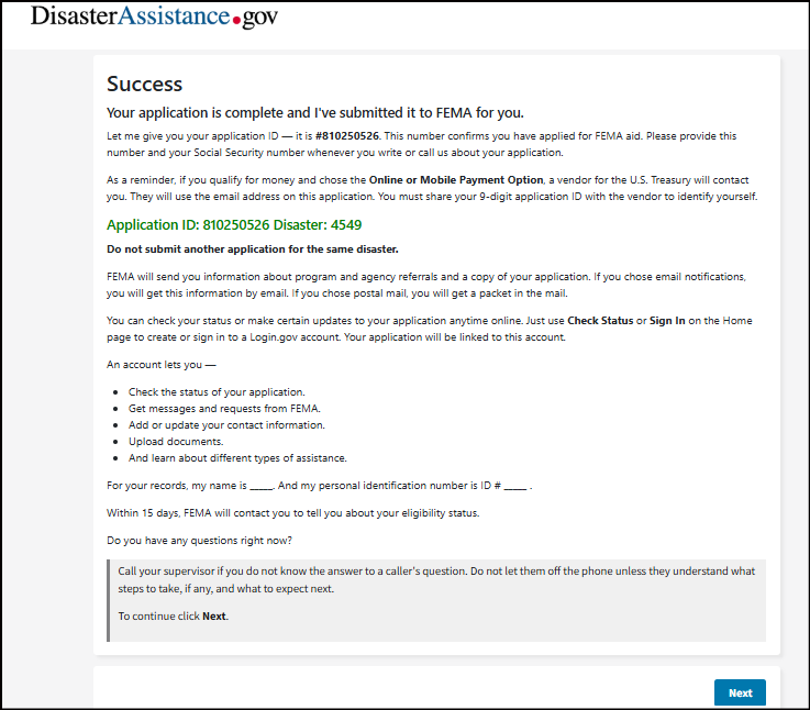 Let me give you your application ID — it is #XXXXXXXXX. This number confirms you have applied for FEMA aid. Please provide this number and your Social Security number whenever you write or call us about your application.