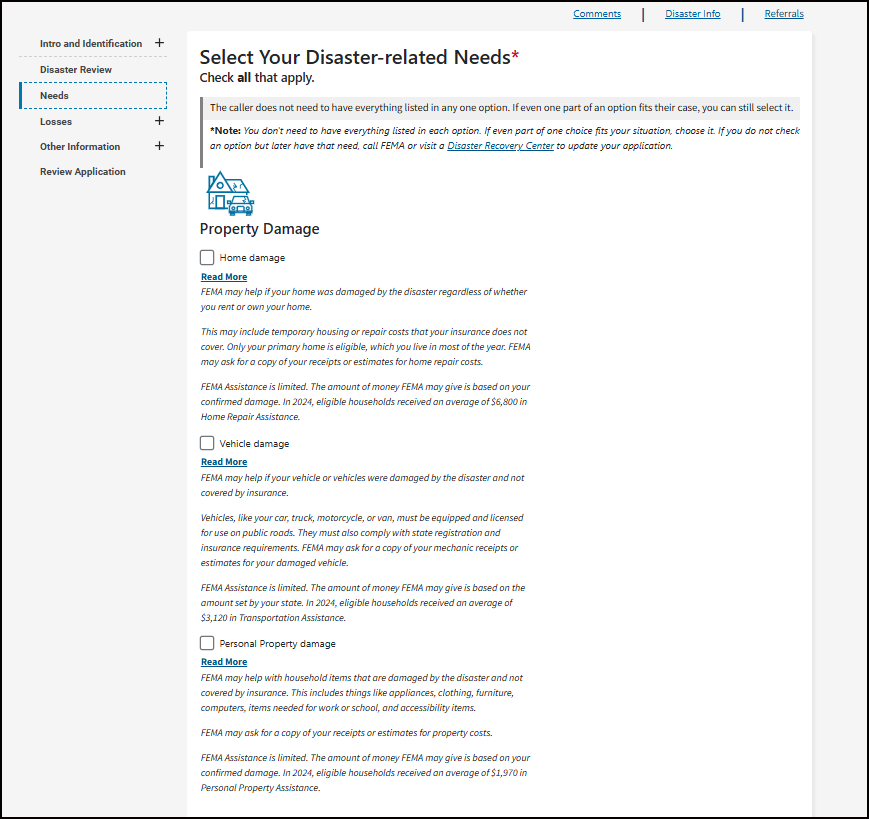 If the caller has business needs ONLY — like business property damage or economic losses caused by the disaster — refer them to the Small Business Administration (lending.sba.gov). SBA offers low-interest disaster loans for home, personal property (including for renters), and business losses.