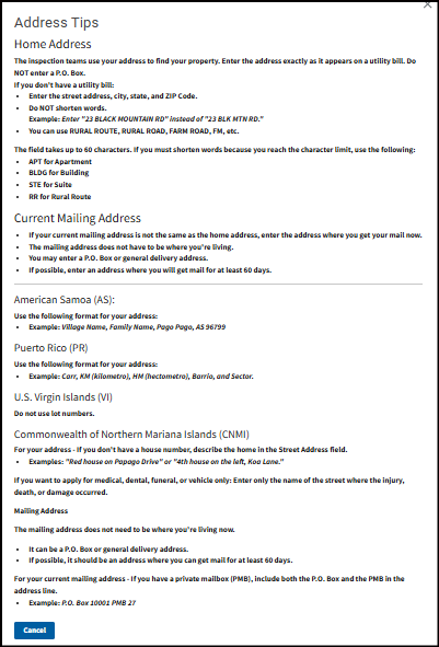 This may be your home address, where your vehicle was damaged, where you sustained an injury from the disaster, or where your loved one passed away from the disaster. To get assistance, your damaged property or where the loss occurred must be in a declared disaster area.